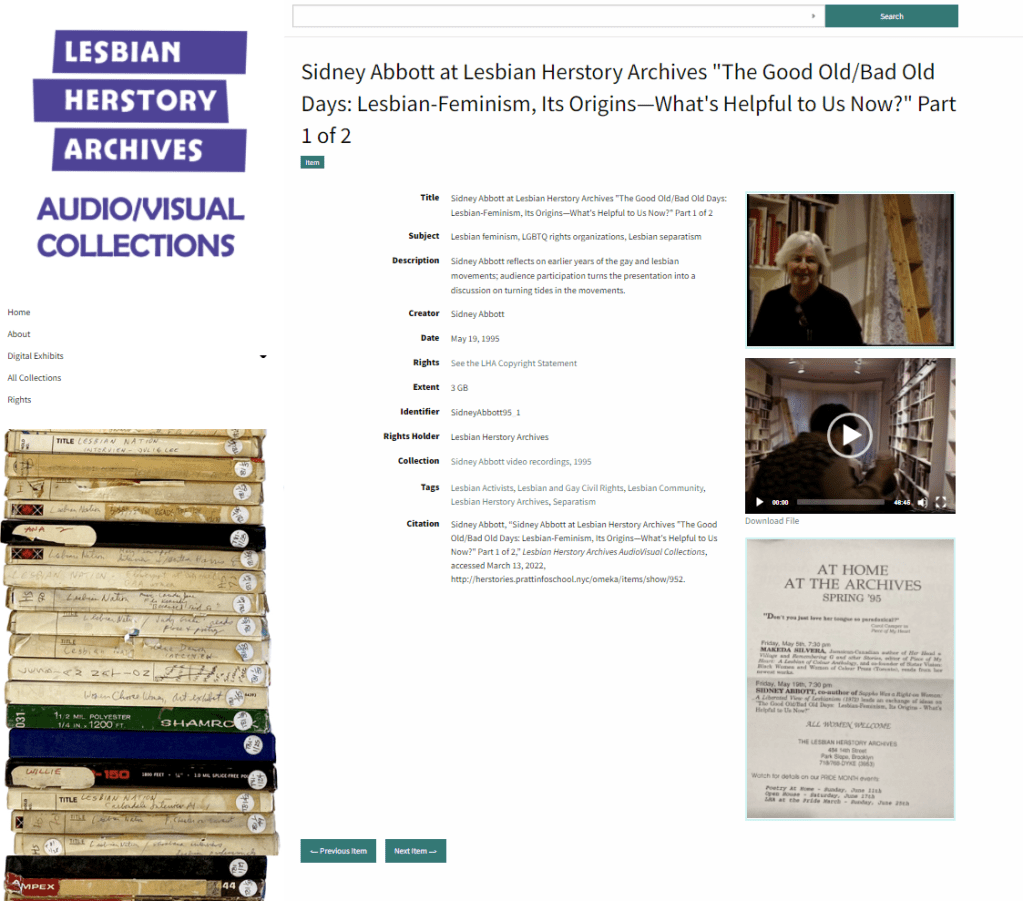 As detailed in my final report, this digitization project was completed for the Lesbian Herstory Archives as a part of the Projects in Digital Archives course. Throughout the semester, in a small group, I worked on the digitization of physical audiovisual materials and stewardship of the resultant digital assets for inclusion in the Herstories Audiovisual digital collections website.
