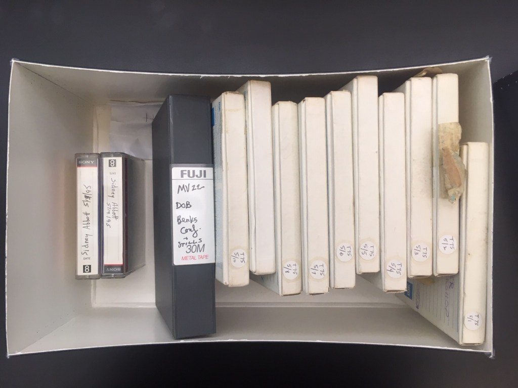 Our group received a small collection of 15 undocumented audio and video tapes, and throughout the course of the semester we digitized the tapes according to best archival practices, managed the outsourcing of two tapes for mold treatment and offsite digitization, recorded metadata and tracked files of digitized materials, created preservation master and fair use copies, and worked together with other teams in our class to match metadata to the files and upload these materials to the digital collections website in order to make them available and accessible.